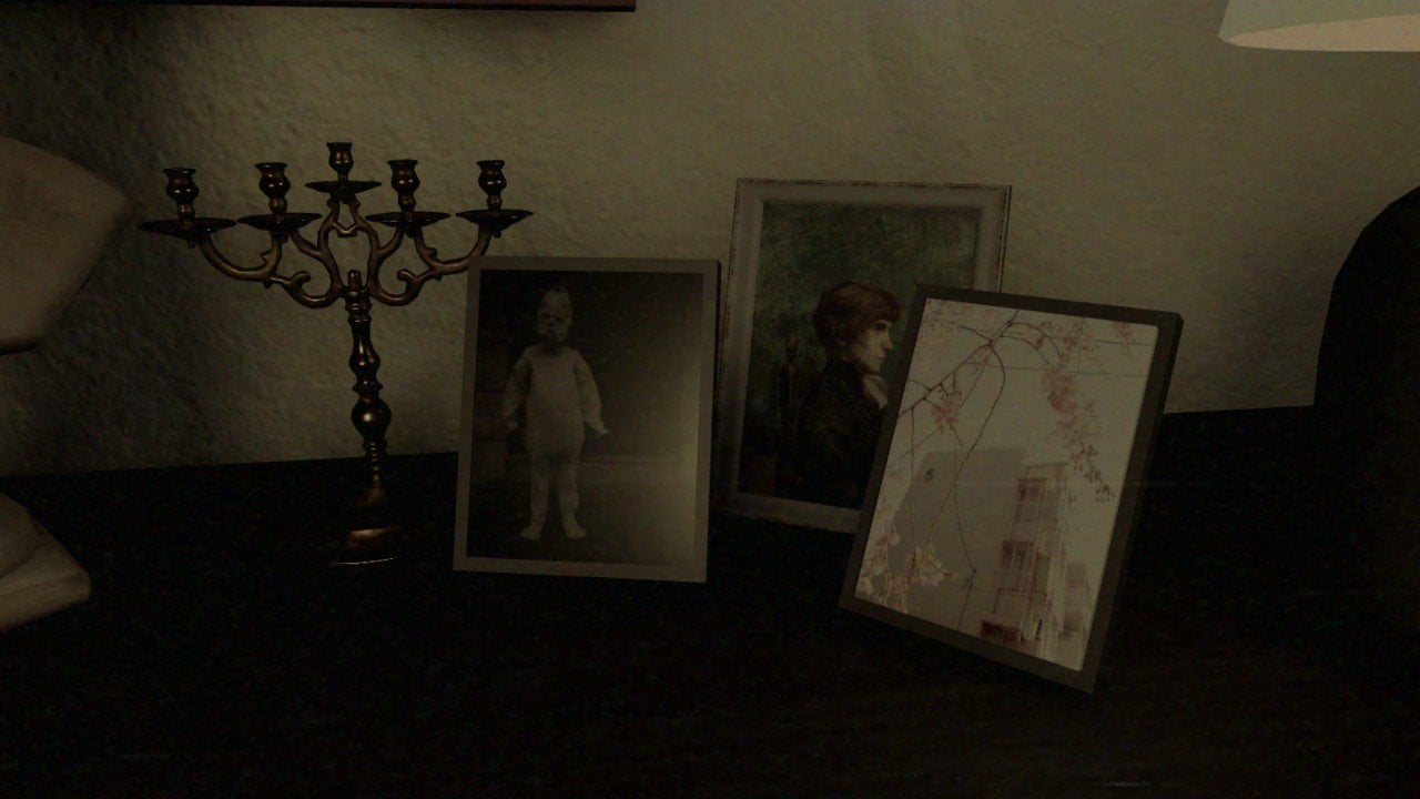 Feature image for our Short Creepy Stories Father's Limbo walkthrough. It shows several framed family pictures on a sideboard in a spooky house.