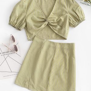 ZAFUL Gingham Puff Sleeve Front Twist Two Piece Skirt Set S Light green