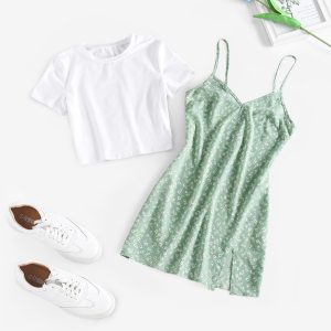 ZAFUL Basic T-shirt and Floral Cami Sundress Set L Light green