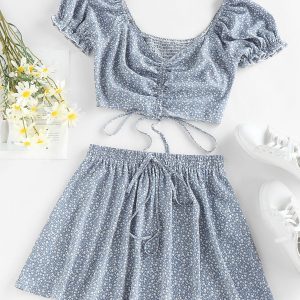 ZAFUL Ditsy Print Ruffle Smocked Cinched Skirt Set S Light blue