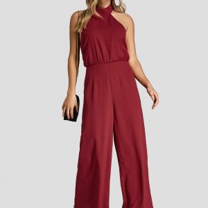Burgundy Backless Design Halter Wide leg Jumpsuit