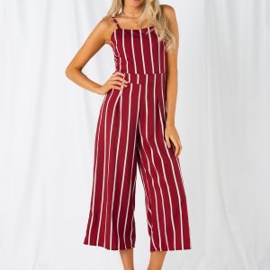 Burgundy Cut Out Lace-up Details Stripe High-waisted Wide Leg Jumpsuit