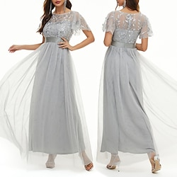 A-Line Party Dresses Floral Dress Wedding Guest Floor Length Short Sleeve Jewel Neck Tulle with Embroidery 2023 Lightinthebox