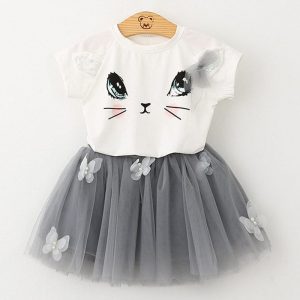 1036 Girls Short Sleeve Set Cute Cat T-shirt Puffy Skirt