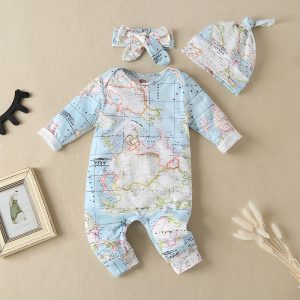3-piece Baby Cotton Map Print Long-sleeve Jumpsuit , Headband and Hat