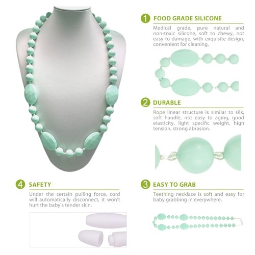 Features: Nontoxic: All of our silicone beads necklaces are made of 100% food grade silicone. (feels like pacifiers nipples) Security certificates: with BPA-Free, FDA, EN71 and F963 certificates as security assurances, it is usually no risk to the baby. Waterproof, heat resistant and odorless, a kind of soft and comfortable nursing jewelry for baby. Our necklace is chic for mum wearing and safety for baby chewing, helping build closer bonding experience between mom and baby.
