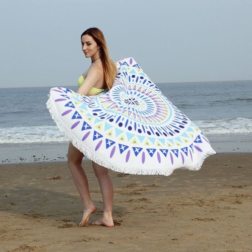 Features: Indian Mandala style beach towel, with fringe tassels design, beautiful and eye-catching. 150cm(59.1in) diameter large size, comfortable for 2 persons to sit on or an adult to lie on. Multi-purpose: can be used as beach towel, picnic blanket, table cloth, beach shawl, tapestry and so on. Lightweight and portable, you can take it to anywhere, such as beach, park, etc. Using breathable and water absorbent Microfiber material, fast drying and soft to touch. Adopting reactive dyeing, not easy to fade, hand washable machine washable.