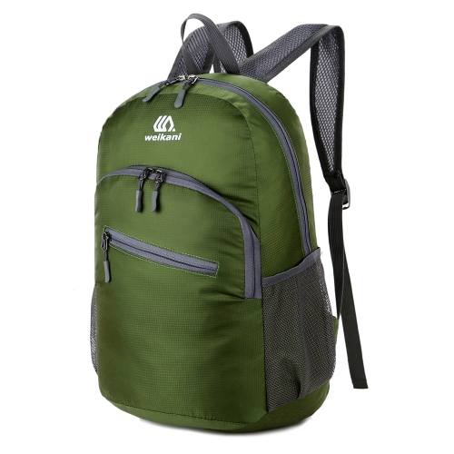 Features: Folds into the compact inner pocket to fit anywhere. Unfolds from pocket to use a 18L backpack. Ripstop and water resistant nylon fabric provides durability with minimal weight (6 oz). Roomy main compartment with two-way metal zipper for easy access to your stuffs. Internal zippered security pocket for valuable items. Two front zipper pockets to hold small accessories; two side pockets for water bottles or umbrellas. Adjustable mesh shoulder straps for optimal breathability and comfort. Perfect for cycling, hiking, camping, travel and other outdoor activities.