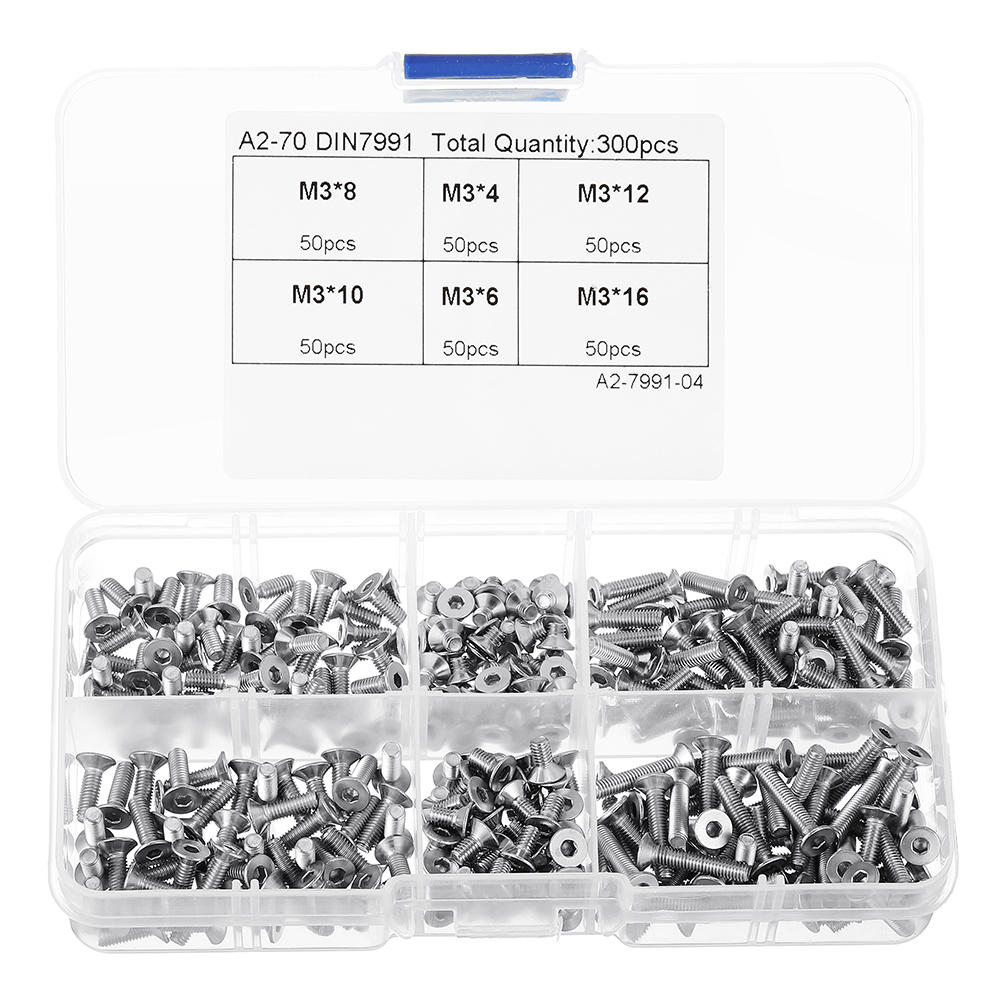 Specification:Material: 304 Stainless SteelColor: SliverSize: M3Type: DIN7991Weight: 180gScrew Drive Type: Hex SocketScrew Head Type: Countersunk HeadFeatures:1.Made of 304 stainless steel material, the 304 stainless steel material provides strength and offers good corrosion resistance in many environments.2.Well packed and assorted in a transparent resealable box for convenient carry and storage.3.These M3 screws will be great replacement for industrial and construction fasteners.2.Apply to rc model, electronic, electrical appliances, electrical, power, chemical, cement, machinery and equipment, furniture and so on.Package Included:50X M3*4mm50X M3*6mm50X M3*8mm50X M3*10mm50X M3*12mm50X M3*16mm