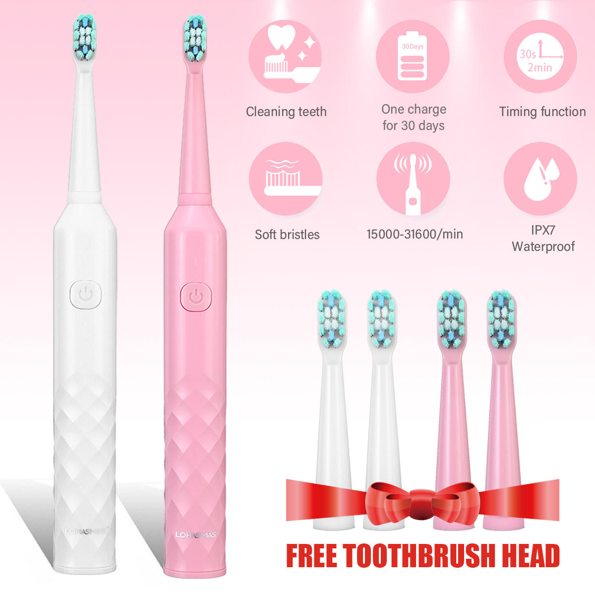 Package Included:1x Electric toothbrush2x Replacement brush headSpecifications:-Vibration speed: 6 gear-Color: white, Pink-Load mode: AA battery (battrey not include)-6 modes: clean, gentle, white, massage1, massage2, soothing-Ruido: 50db-Time of work: 2 times a day, 120 seconds / hour, approximately 30 days-Operating temperature: 0 ℃ -40 ℃Features:-6 vibration modes are clean, gentle, white, massage1, massage2, soothing to help reduce tooth decay.-The whole body of waterproofing design the fuselage can withstand the washing water and bubbling base IPX7 waterproofing can be put in water for a short time of performance is not affected.-The ultrasonic toothbrush cleans the dental plaque better.-2 minutes of time, 30 seconds of pause to replace the area.