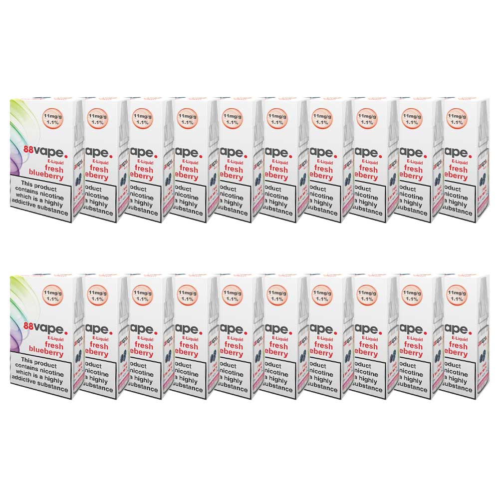 Get massive savings with this Bulk Box of 20 bottles. This e-liquid flavour of blooming berries features a high 80% PG (Propylene Glycol) and 20% VG (Vegetable Glycerin) ratio – meaning more vapour and more flavour as well as reducing throat irritation. UK made with 100% organic and natural ingredients, this e-liquid features 11mg nicotine content.Every 88Vape bottle is made with a long plastic nip, so it’s easier to fill your clearomizer and start vaping.What’s included 88Vape E-Liquid 11Mg Fresh Blueberry 10ml – 20 pack