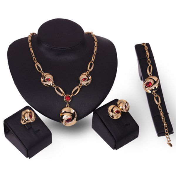 A Suit of Stylish Faux Ruby Rhinestone Hollow Out Necklace Bracelet Ring and Earrings For Women