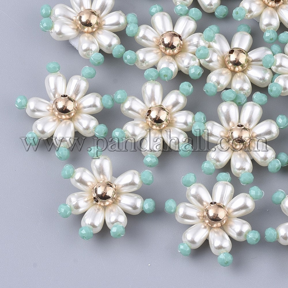 ABS Plastic Imitation Pearl Cabochons, Cluster Beads, with Glass Beads and CCB Beads, Non-Woven Fabric, Flower, TurquoiseSize: about 22~24mm in diameter, 8~10mm thick.
