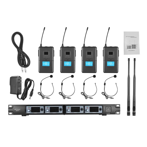 Features: Professional 4 channel UHF 610-680MHz wireless headset microphone system. High sensitivity, super clear sound, great anti-interference capability. Effective working range up to 80 meters in open-area. With standard XLR balanced and 1/4 mixed output interface. Independent volume adjusting knobs for 4 channels, AF/RF indicator light. One bodypack run on 2 * AA batteries(not included), and supplied with a power adapter for the receiver, 1/4 audio cable. Ideal for classroom, meeting, mall exhibitions, coaches, giving a speech, presentation and public address, outdoor activities etc.