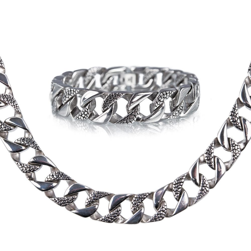 We have added an interesting designer twist to a classic heavy weight curb bracelet and necklace in the form of an embossed reptile pattern. We have of course continued to use only the finest 316L premium grade solid stainless steel to maintain the feel and quality you expect. Necklace measures 24", bracelet fits up to a 8.5" wrist.