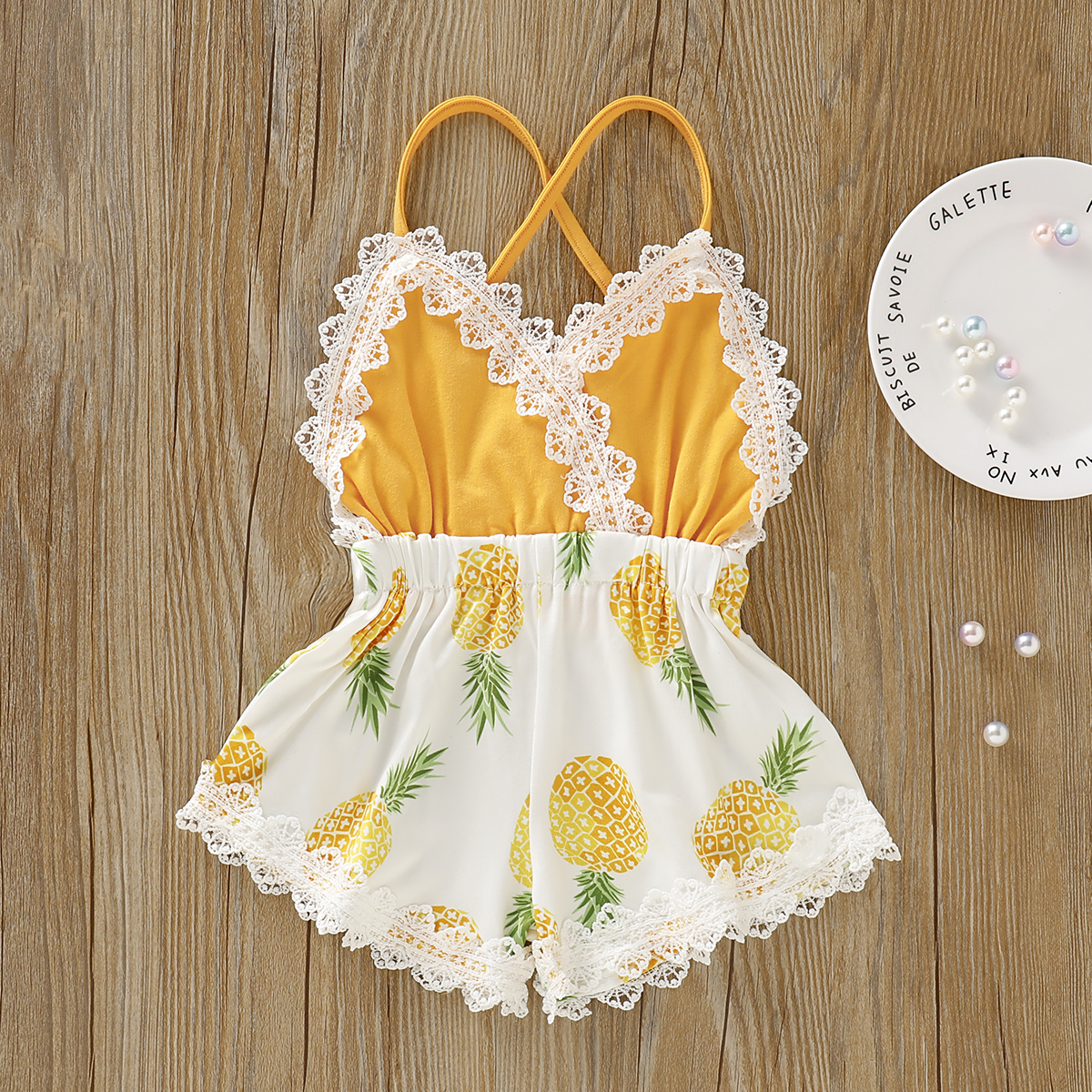* You can choose pineapple or sunflower print romper. * NOTE: Self-tie straps, adult supervision needed. * Elastic waist * Material: 95% Cotton, 5% Polyester * Machine wash, tumble dry * Imported
