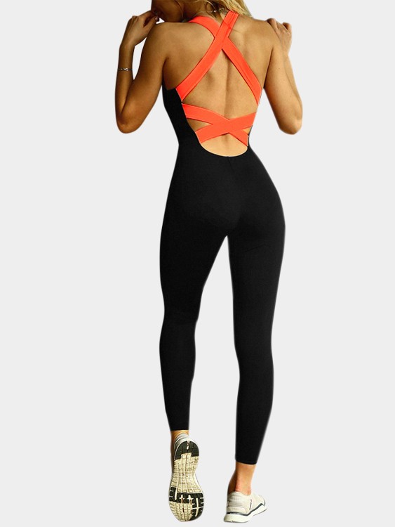 Black And Orange Fashion Stretch Cross Back Bodycon Sleeveless Maxi Jumpsuit