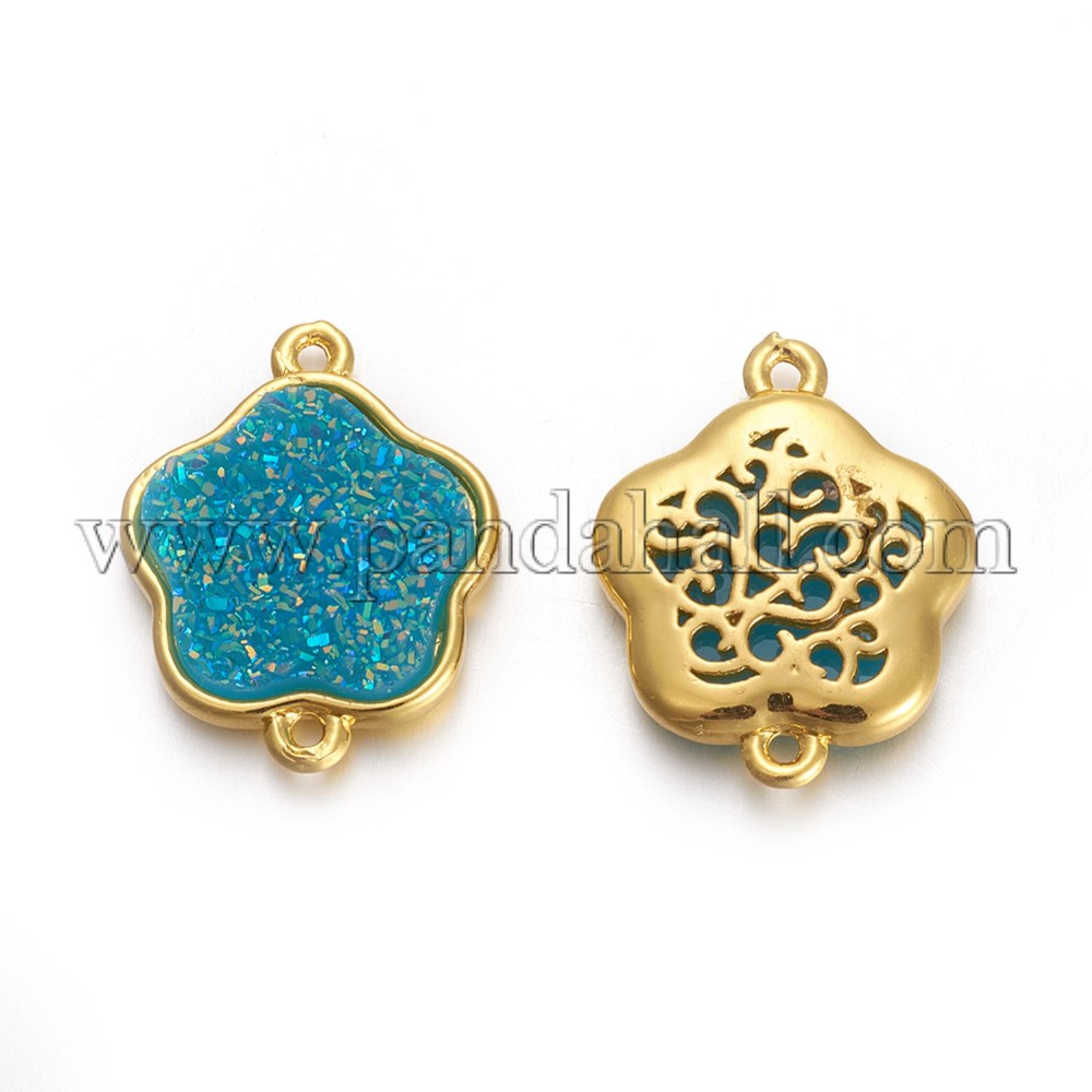 Brass Links/Connectors, with Druzy Resin, Golden Plated Color, Flower, DeepSkyBlueSize: about 15mm wide, 18.5mm long, 3.5mm thick, hole: 1.1mm