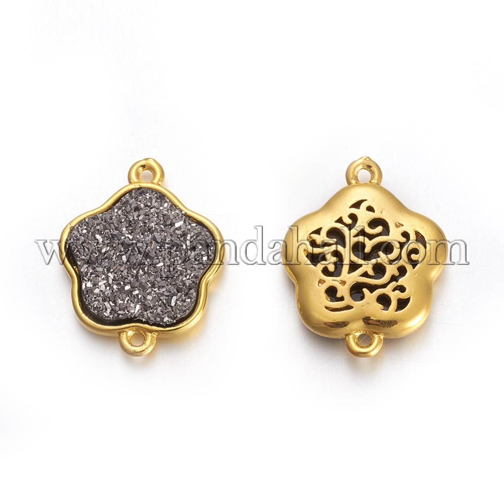 Brass Links/Connectors, with Druzy Resin, Golden Plated Color, Flower, GraySize: about 15mm wide, 18.5mm long, 3.5mm thick, hole: 1.1mm