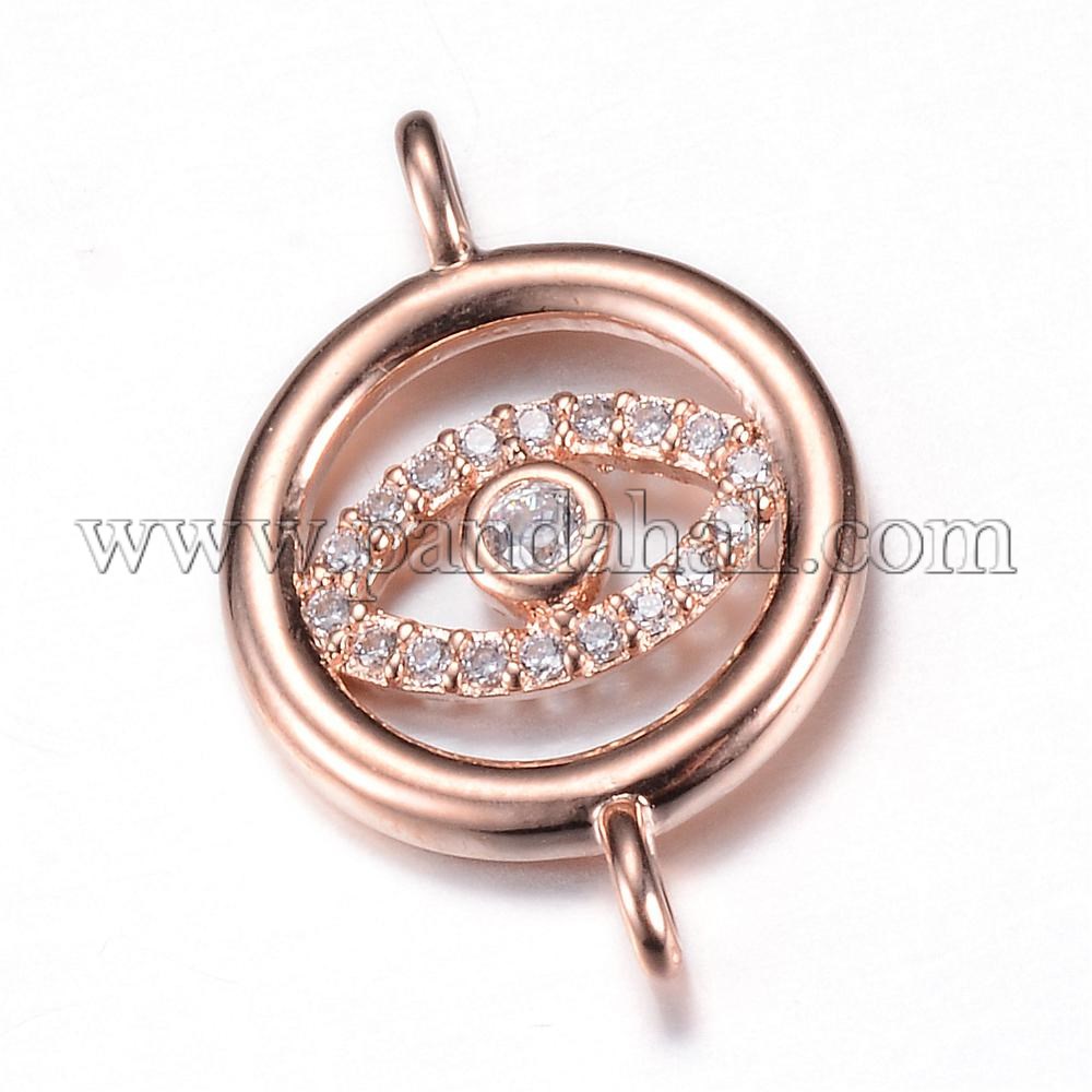 Brass Micro Pave Cubic Zirconia Links, Flat Round with Evil Eye, Rose GoldSize: about 22mm long, 15mm wide, 1.5mm thick, hole: 1.5mm.