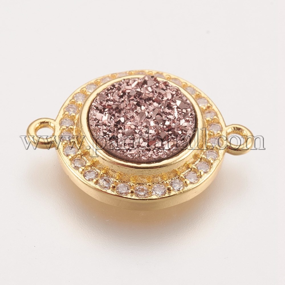 Brass Micro Pave Cubic Zirconia Links, with Druzy Resin Cabochon, Flat Round, Golden, RosyBrownSize: about 17mm long, 13mm wide, 3~5mm thick, hole: 1.2mm.