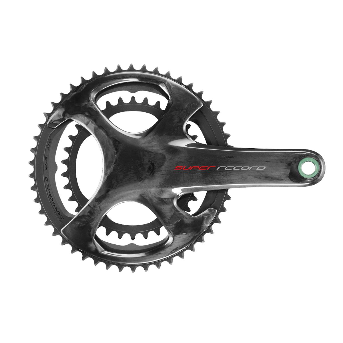 SUPER RECORD 12X2 SPEED CRANKSETThe new Super Record™ 12×2 Speed crankset: an intense concentration of innovation that results in the greatest possible stiffness and precision in derailing, whilst providing a dedicated aerodynamic “super design”.The new carbon fibre Super Record™ 12×2 Speed crankset has been made lighter on the inside through Campagnolo Hollow Technology, which uses the Ultra-Torque bracket system with a titanium axle to transfer all of the force the athlete applies to the pedal to the drivetrain. The new Super Record™ 12×2 Speed crankset can be installed on any type of frame, whether or not it is being used with disc brakes because it optimises the chain line on the frame with ahub flange measuring 130, 135 or 142 millimetres, without affecting the Q factor, which remains constant at 145.5 millimetres thanks to the new hand crank design.The use of ceramic Cult bearings leads to obtaining the smooth ride that the Campagnolo brand is known for. The innovative design of the outer chainring ensures faster, quieter derailing owing to the contoured pin. The symmetrical design of the inner chainring teeth allows improved stability with chain crossovers. The double wheel sizing standards (112 and 145 millimetres) combined with the eight fixing screws, optimises weight and stiffness through the increased use of carbon fibre.The varying number of pins for each of the three chainring combinations (34/50, 36/52, 39/53) facilitates upshifting due to the optimised free strokes associated with each combination. The special drains on the inside of the outer chainrings optimise performance when downshifting in dead spots.Length 165, 170, 172.5, 175mmCombinations 39/53 – 36/52 – 34/50Weight 618 gr. (172,5 mm, 34-50, 2 bearings assembled)FEATURES & BENEFITSNew design, same dimensionsCompatible with all frame systems, regardless of the width of thechainstayThe right hand crank arms are coupled two by two in the zones subject to greater force applied by the cyclist.They provide maximum stiffness to the crankset during upshifting.Unchanged Q Factor (145.5)Both the dimensions and the pedalling biodynamics remain unchanged.Unidirectional carbon fibre hand cranks, steel axle and aluminium chainrings.Substantial stiffness and excellent power transfer.Symmetrical inner chainring teeth.Fluid and precise drivetrain, even with the greater crossovers.Optimised design for every chainring combination.Maximum performance, always.Double wheel sizing standards.Improved system stiffness and reduced weight due to increased use of carbon fibre.Superficial treatment of the chainrings for a longer lifespan.