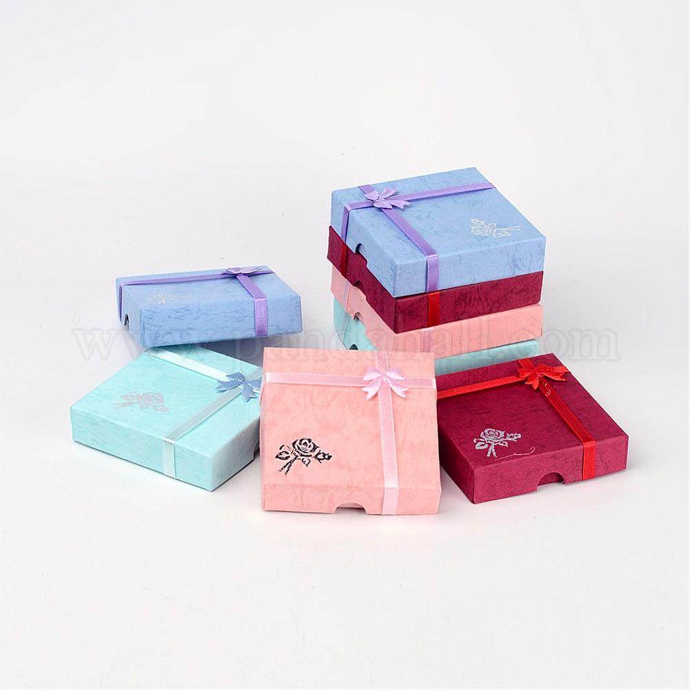 Cardboard Bracelet Boxes with Flower, Sponge and Fabric inside, Square, Mixed-Colorabout 9cm long, 9cm wide, 2cm thickStill worry about where to put your jewelry ornaments? This is easy for the jewelry boxes can solve this problem for you. It is used to store your bracelets. The sponge inside is to keep the bracelet from crashing especially for those delicate ones. Bowknots tied on the surface make it more elegant. You can use it to store your jewelry or send to your friends as a gift box.