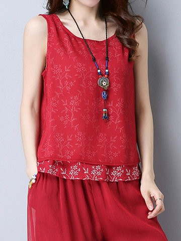 Casual Women Flower Printed Sleeveless Double-Layer Tank Tops