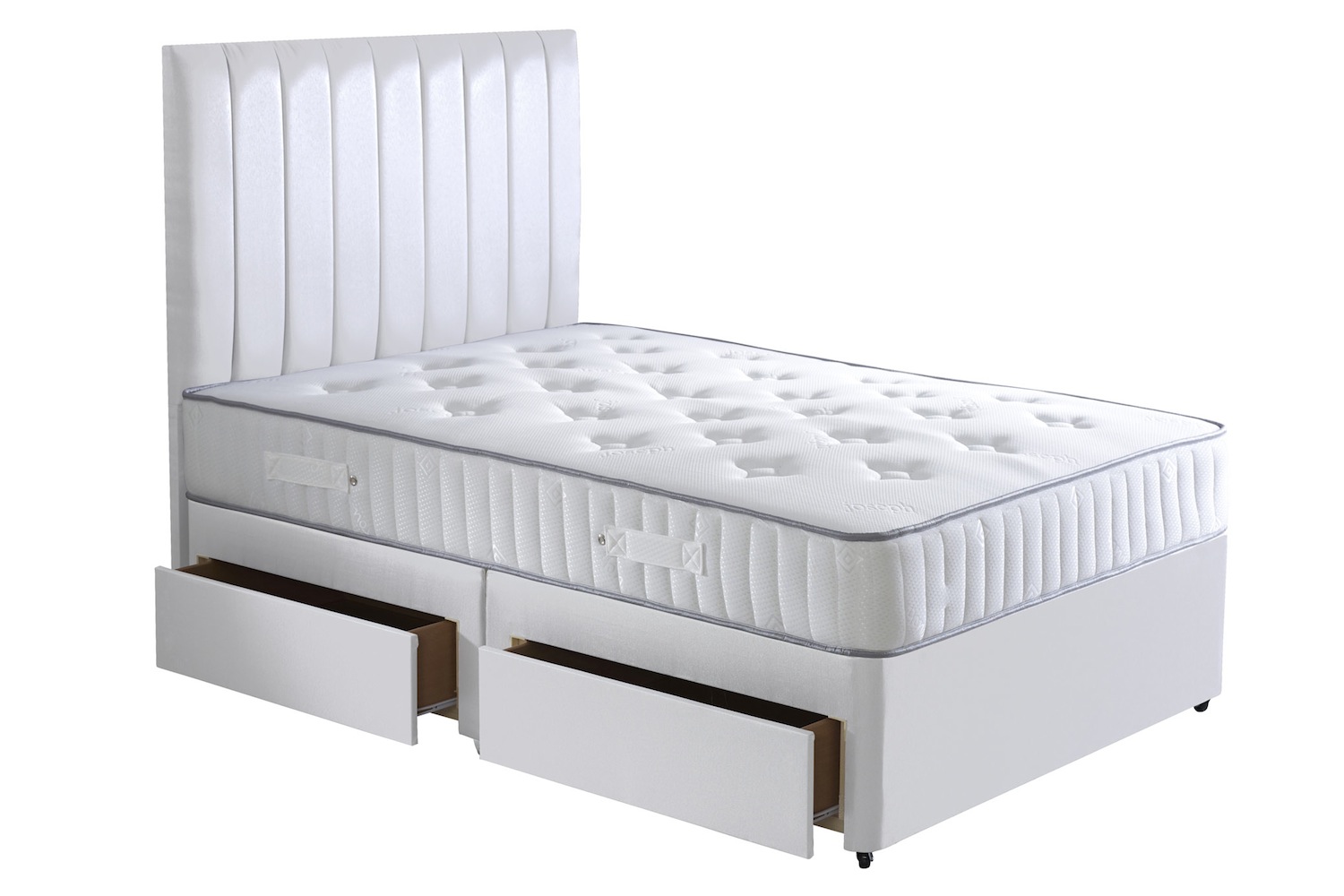 The Diamond Pocket Spring Series 2000 Deluxe Divan Bed featured a supportive medium comfort mattress that has been designed to maximise support by using high specification UK manufactured pocket springs and luxury rebounce fibre fillings for extra longevity. Deep layers of fillings cover the spring system to provide a plush sleeping domain which ensures a restful night’s sleep. The luxurious fabric used to cover the mattress is soft to the touch and flexible. There are also flag stitched turning handles on both sides of the mattress for easy care and brass vents which will guarantee that the mattress stays fresh and healthy for many years to come, the mattress is completed with a 14 inch deep divan base available in a wide selection of fabrics and colours.