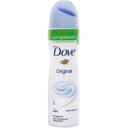Dove Compressed Original Anti-Perspirant Deodorant SprayDove Compressed Original Anti-Perspirant Deodorant Spray contains one quarter moisturising cream and vitamin E to improve the look and feel of underarm skin. It provides effective 48 hour protection from wetness and odour and leaves underarms visibly soft and smooth and feels gentle on your skin.Dove Compressed Original Anti-Perspirant Deodorant Spray is alcohol free.The Dove Compressed range uses an innovative spray system which uses less gas so you get the same protection in each spray but with less packaging. Each 75ml compressed spray will last just as long as the traditional 150ml spray and is used in the same way.