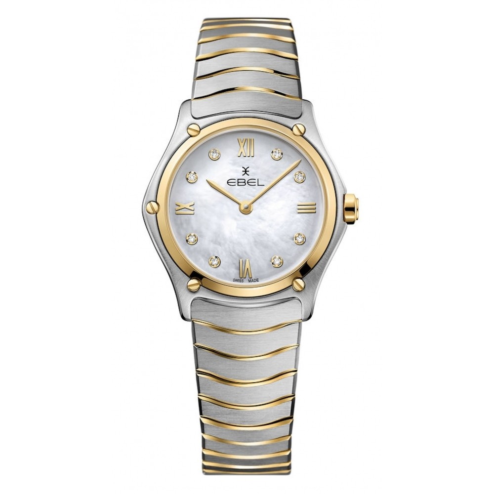 Women’s EBEL Sport Classic, stainless steel and 18K yellow gold case, O 29.0mm, white mother-of-pearl dial with applied Roman numerals and 8 diamonds (0.052 ct), sapphire crystal with anti reflective treatment underneath, two-tone stainless steel wave link bracelet with a deployment , Swiss quartz movement, water-resistant up to 50 Meter. We are a EBEL UK authorised dealer Brand new boxed stock with full retail boxes & paperwork 3 year warranty