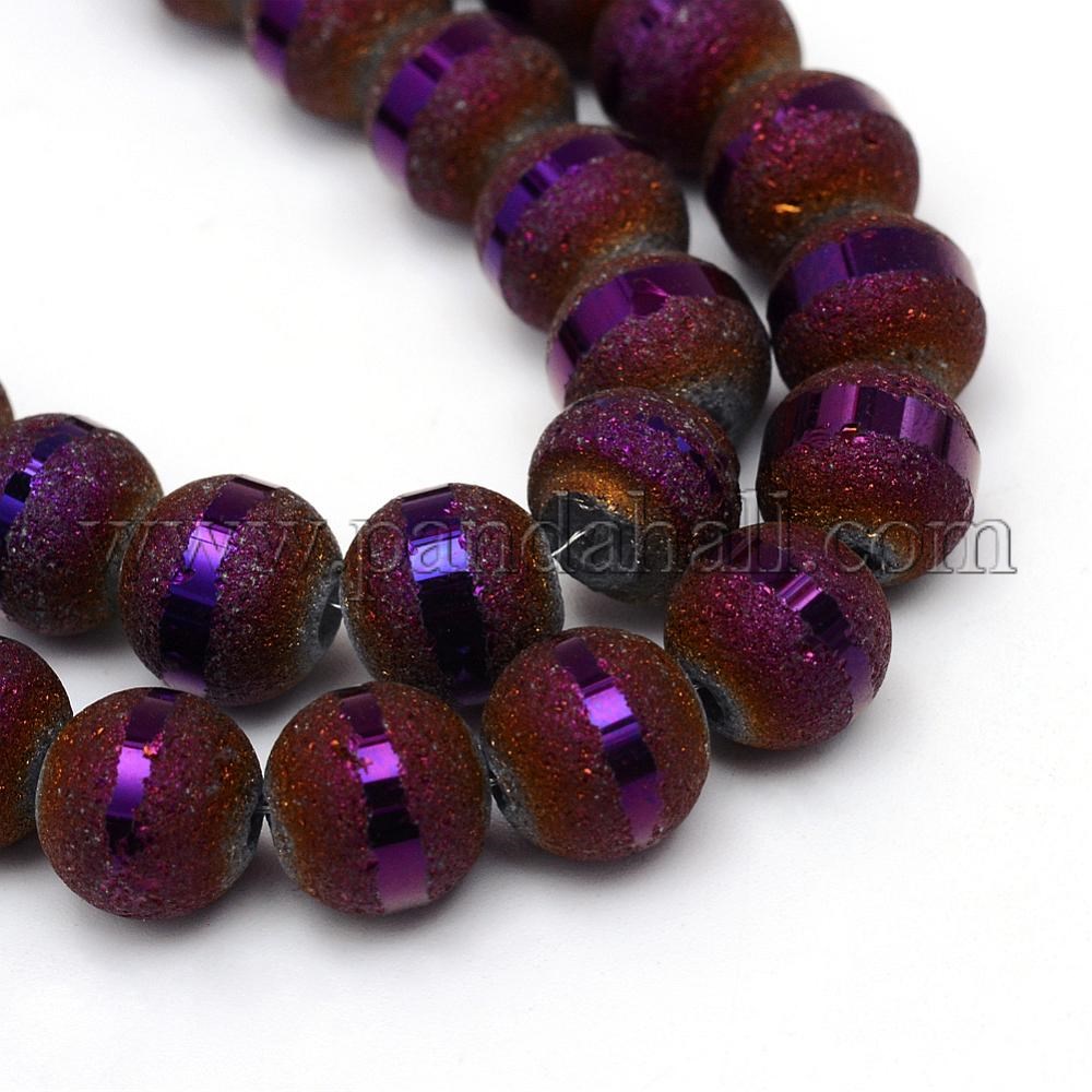 Electroplate Glass Bead Strands, Frosted, Round, Purple PlatedSize: about 8~9mm in diameter, hole: 1.5mm; about 72pcs/strand, 24.4″.