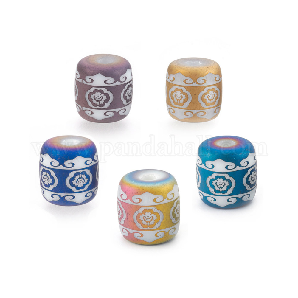 Electroplate Glass Beads, Frosted, Barrel with Flower Pattern, Mixed ColorSize: about 12mm long, 11.5mm in diameter, hole: 3mm; 72pcs/box; packing: 7.4x13x2.5cm.