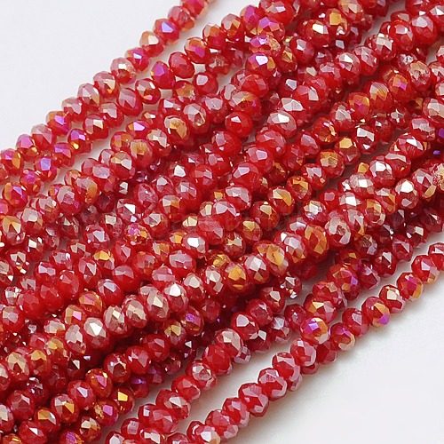Electroplate Glass Beads Strands, AB Color, Faceted, Rondelle, RedSize: about 4mm in diameter, 3mm thick, hole: 1mm; about 138pcs/strand, 16.5″.Colorful glass beads with plated appearance create wonderful light reflection. The decent designs make them a popular choice for whimsical jewelry. It can be matched with pins and jumprings, to make bracelets, necklaces or earrings.