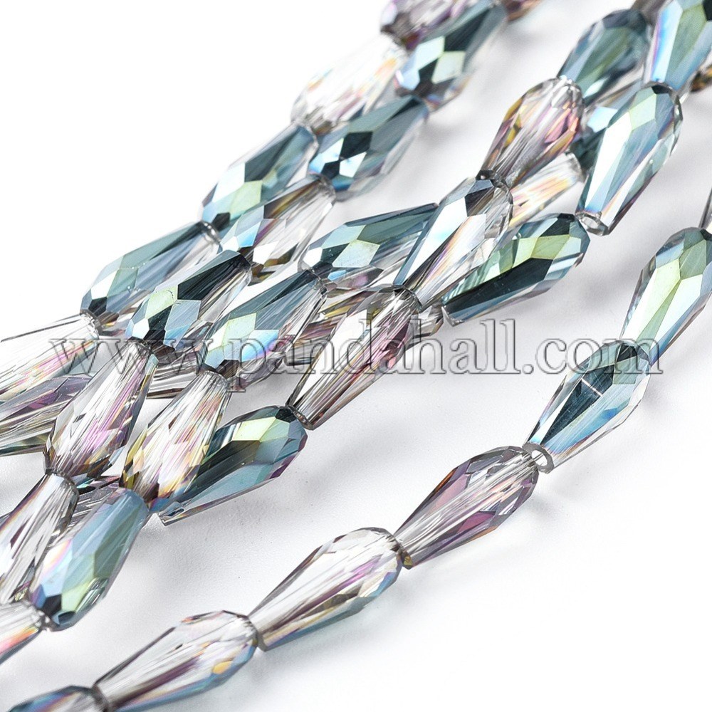 Electroplate Glass Beads Strands, Half Plated, Faceted, Teardrop, Green PlatedSize: about 4mm wide, 10mm long, hole: 0.8mm; about 70~72pcs/strand, 27.9″~28.15″(71~71.5cm).