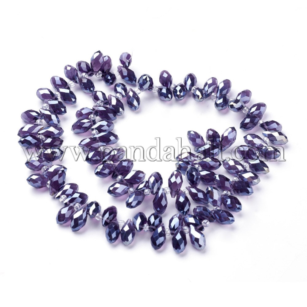 Electroplate Glass Faceted Drop Beads Strands, AB Color Plated, DarkSlateBlueSize: about 6mm wide, 11.5~13mm long, hole: 1mm; about 100pcs/strand, 16.5″.Colorful glass beads with plated appearance creates wonderful light reflection. It can be matched with hooks, jumprings, and pins to be earrings, bracelets and so on.