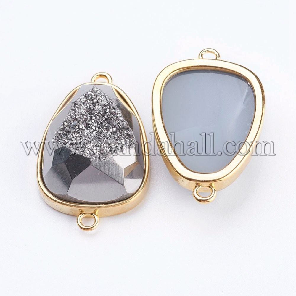 Electroplate Natural Druzy Agate Links/Connectors, with Golden Tone Brass Finding, Drop, GraySize: about 17mm wde, 27mm long, 8mm thick, hole: 2mm.