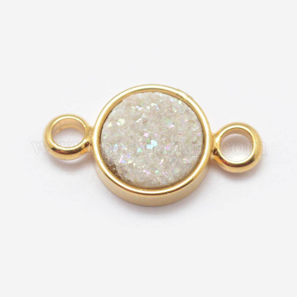 Electroplated Natural Druzy Agate Links/Connectors, with Brass Findings, Flat Round, Golden, Creamy WhiteSize: about 7mm wide, 13mm long, 2.5mm thick, hole: 2mm.