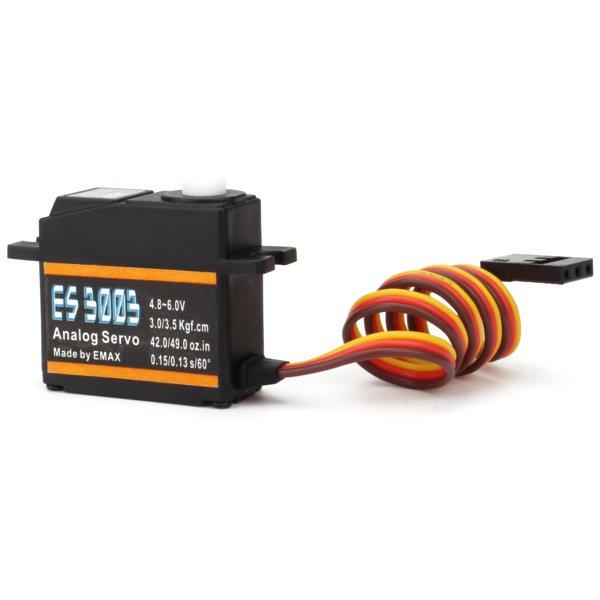 EMAX ES3003 17g 3.5kg 0.13sec Plastic Gear Analog Servo For RC AirplaneSpecifications:Brand NameEMAXItem NameES3003Operating Voltage4.8V – 6.0VSTD DirectionCounter Clockwise / Pulse Traveling 1500 to 1900secStall Torque4.8V3kg.cm MaxOperating Speed4.8V0.15 sec/60 at no loadStall Torque6.0V3.5kg.cm MaxOperating Speed6.0V0.13sec/60 at no loadSize28.45×13.00×31.10mmWeight17gPlug AvailableFUT;JRFlower Head23TMaximum Travel14510 (700-2300 sec)OthersBearing; Plastic; AnalogNote: This servo is the upgraded version ofES3103.Package Included:1xEMAX ES3003 17g Servo