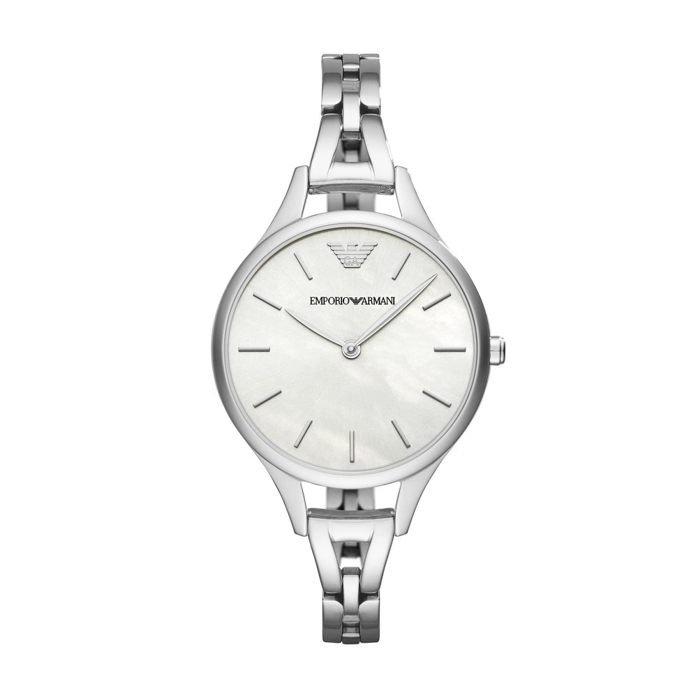 Emporio Armani AR11054 Women’s Mother Of Pearl Wristwatch Item Shape – Round Dial Window Material Type – Mineral Display Type – Analogue Clasp Type – Fold Over Clasp Case Material – Stainless Steel Case Diameter – 32 millimetres Case Thickness – 6 millimetres Band Material – Stainless Steel Band Length – Women’s Standard Band Colour – Silver Tone Dial Colour – Mother Of Pearl Bezel Material – Stainless steel Calendar – Does not have a date function Movement Quartz Water Pressure Resistance – 5 bar Warranty Type – Manufacturer Warranty Description – 2 yearsSleek and feminine, this ladies Emporio Armani watch gleams with a glossy white mother of pearl dial, silver tone indexes, stainless steel case and jewellery bracelet with fold over clasp. We are a Emporio Armani UK authorised dealer Brand new boxed stock with full retail boxes & paperwork 2 year warranty