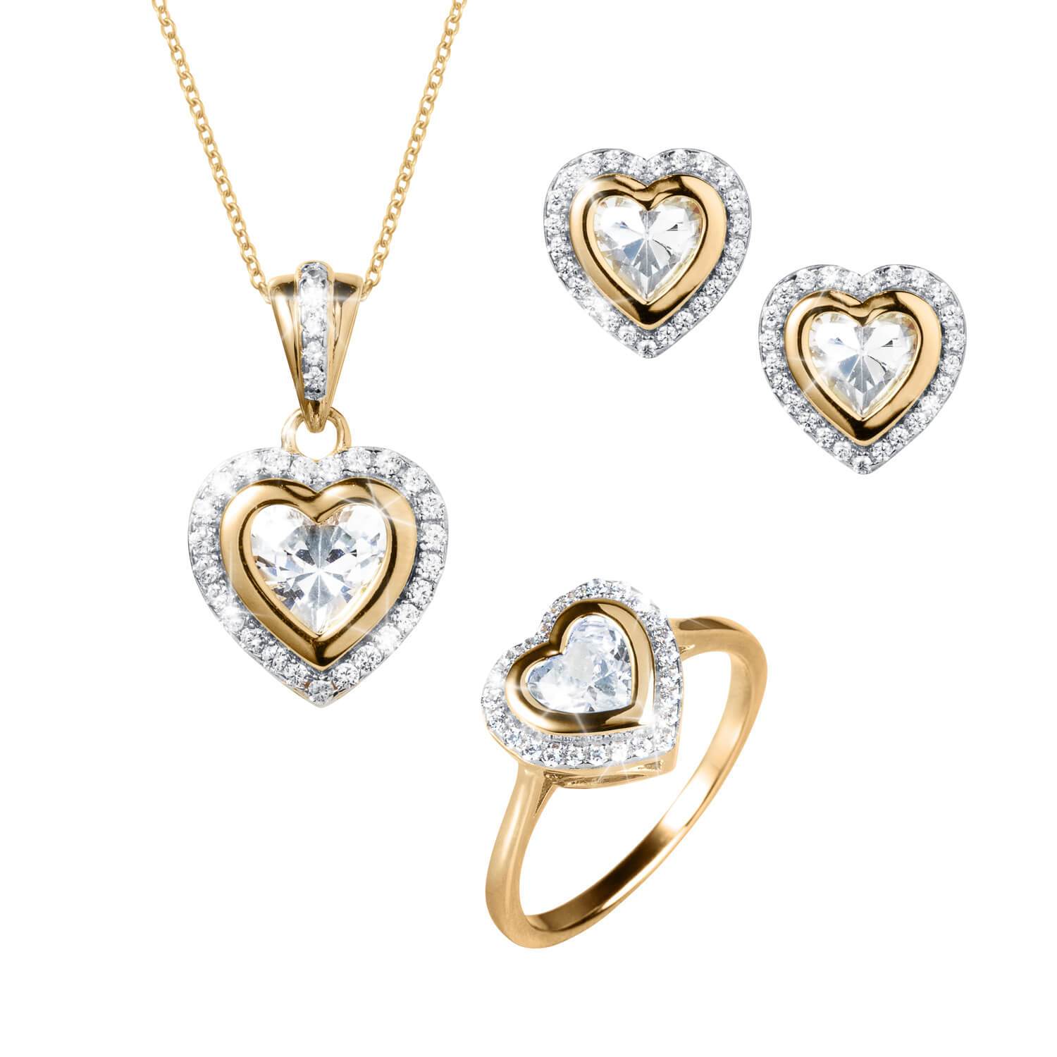 This gorgeous collection of tasteful heart jewelry is crafted with love. Set in sterling silver with precious gold plating. Set into the center is a shimmering white Diamondeau®, the supreme diamond alternative, surrounded by a glorious gold heart shaped frame. This is definitely one gift that is going to be shown off and treasured for a lifetime.