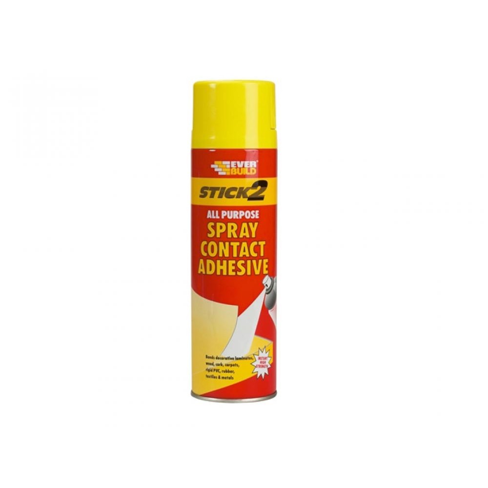 The Everbuild brand is not only hugely popular with tradesmen and DIY’ers. It’s quite literally huge – the biggest range in the business. In addition to core manufactured products the Everbuild range includes a wide range of ancillary items from sealant guns to dust sheets, line markers to masking tape.The range of products Everbuild actually manufacture is extensive, from chemical blending for admixtures and water proofers through water based sealant manufacturing to the highly advanced polymer engineering undertaken in manufacturing silicone and hybrid sealants, as well as adhesives and a wide range of powder products.Everbuild Stick 2 All Purpose Spray Contact Adhesive is a sprayable glue which bonds to most common materials including wood, concrete, stone, tiles, rubber, foam, metals, rigid plastics, polyethylene, canvas fabrics, cardboard, paper and cork.It is ideal for securing most carpets/floor coverings. Suitable for internal and external use, giving permanent or temporary adhesion. It provides good adhesion with a good rate of tack development, is easy to use with no messy spreading / clearing up and is halogen and CFC free.Size : 500 ml.