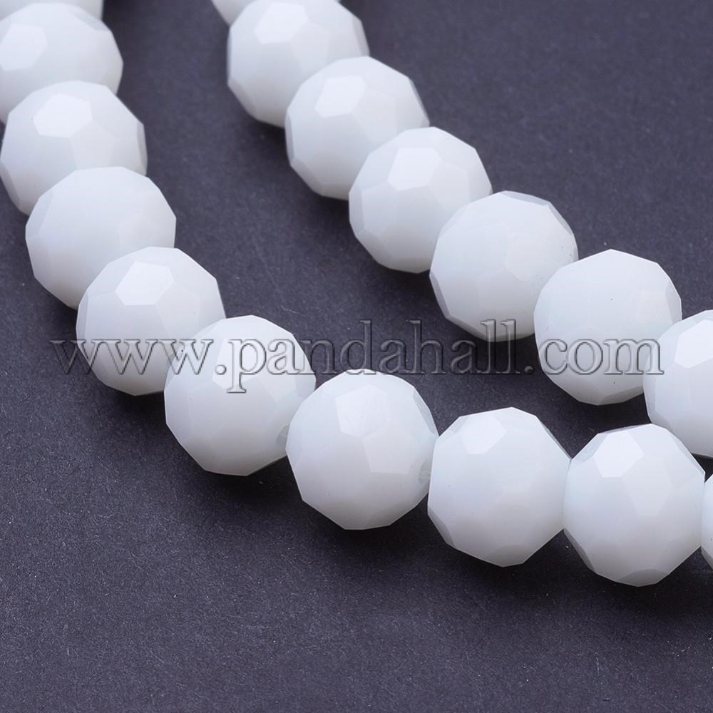 Faceted Glass Beads Strands, Round, WhiteSize: about 8mm in diameter, hole: 1mm; about 70~72pcs/strand, 22.6″.Glass beads with faceted sections are shining and fascinating. Its transparent appearance is full of beauty of pure and simple. Glass beads alaways give people a feel of elegant and exquisite. It can be matched with hooks, jumprings, and pins to be necklaces, bracelets and so on.