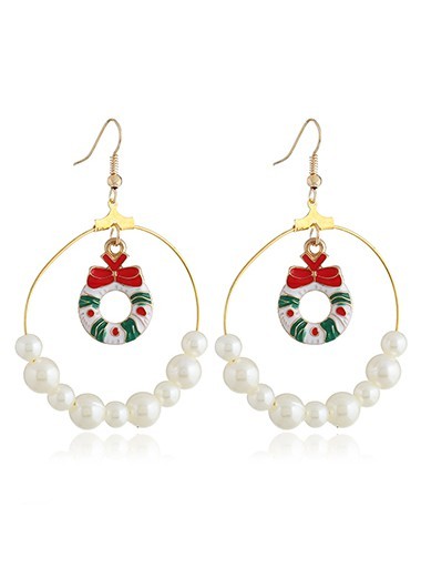 Faux Pearl and Christmas Wreath Pendant Gold Metal Earrings FREE Shipping & 30 Days Easy Return