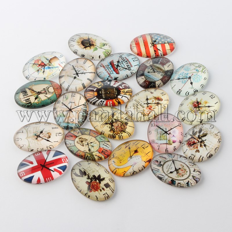 Flower Background Clock Theme Ornaments Glass Oval Flatback Cabochons, Mixed ColorSize: about 30mm wide, 40mm long, 7mm thick.