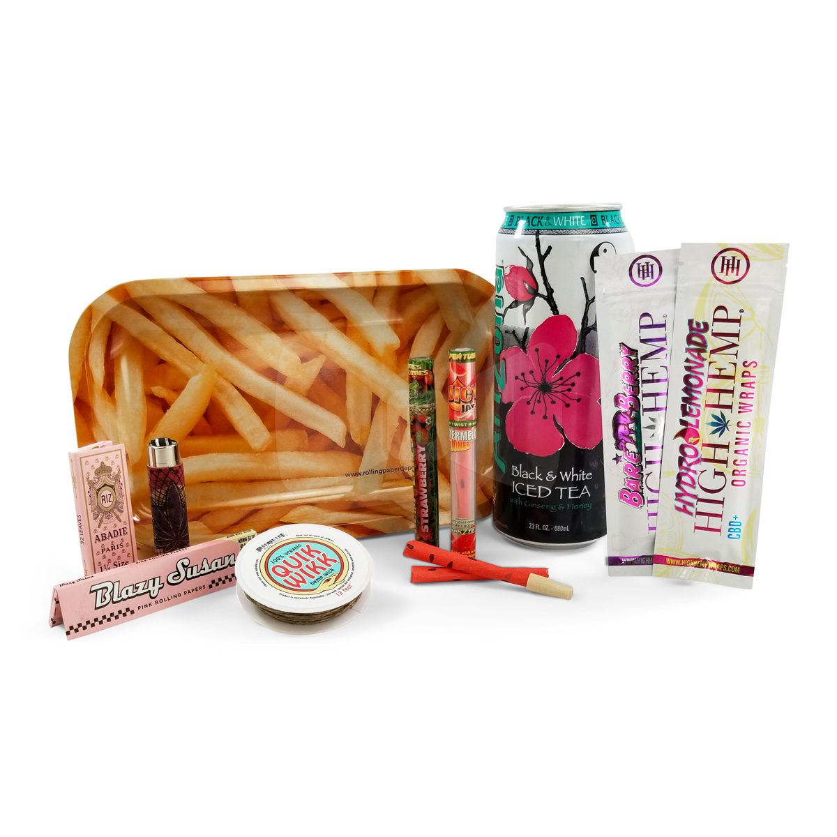 Treat yourself to this perfectly crafted “Fries Before Guys” bundle. Take a break from the day-to-day drama when you roll up your favorite legal smoking herb on the included fry print rolling tray! The included High Hemp flavored wraps or the iconic pink Blazy Susan papers will surely impress even the pickiest smoking connoisseur! Light up one of the included Juicy Jays pre-rolled cones with your new Clipper lighter or Quik Wikk hemp wick to relax and unwind. Finally, stash away all of your accessories in the discreet and lovely Arizona Tea Stash Can! Items included in this bundle: Cork Leaves Clipper Lighter (One Lighter) Quik Wikk Hemp Wick High Hemp Hydro Lemonade High Hemp Bare Berry Blazy Susan King Size French Fries RPD Rolling Tray Arizona Ice Tea Stash Can Abadie 1 1/4 Rolling Papers Cyclones Hemp Strawberry Cones Juicy Jays Watermelon Jones