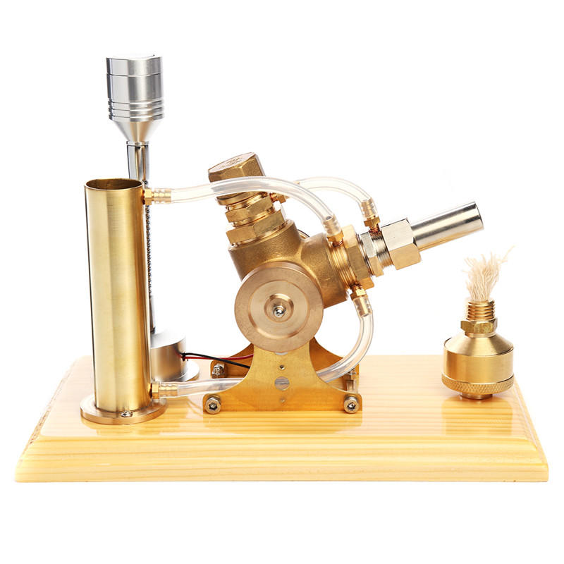 Description:Product Name: Stirling Engine ModelSize: 22x12x12cm/8.6×4.7×4.7Flywheel Diameter: 3.8cm/1.49Copper tank inner diameter: 2.3cm/0.9Color: copperyBase material: woodBody material:brassPower Output: 10 VoltageFeatures:Water cooling design, pure copper made of water tank, with the appropriate water, the engine can work well over 30 minutes runningFull brass shell including fuel-burner which is full brass-made, unique and exquisiteNothing regular maintenance need , just play and enjoying a LED lamp equipped (flexible feet for different angle adjustable), it can work as lighting lampPowerful, up to 3000RPM revolution speed while very low noise, a heavy design that make an excellent heat emissionThis engine is completed assembled and ready to run, just a 10S pre-heating to run and stay a stable running speed 30S laterGood human-friendly design: magnet pad was install on burner seat which well attached the burner to avoid burner movingSuper rugged ( 6mm thickness solid stainless steel base plate)Super high grade design, 34mm(dia) x 9mm(D) pure brass flywheel, with pure brass pulley includedUsage:1.Placed the Stirling engine in a horizontal position, use your hand to toggle the flywheel to see if it is smooth.2.Check if every sliding parts is clean.3.Light the alcohol burner, toggle the flywheel after 2 minutes.Note:1.After using it, please let the engine natural cool.2.Do not touch the alcohol burner, burned tube or the metal to avoid burns.3.Rods at both ends of the activ