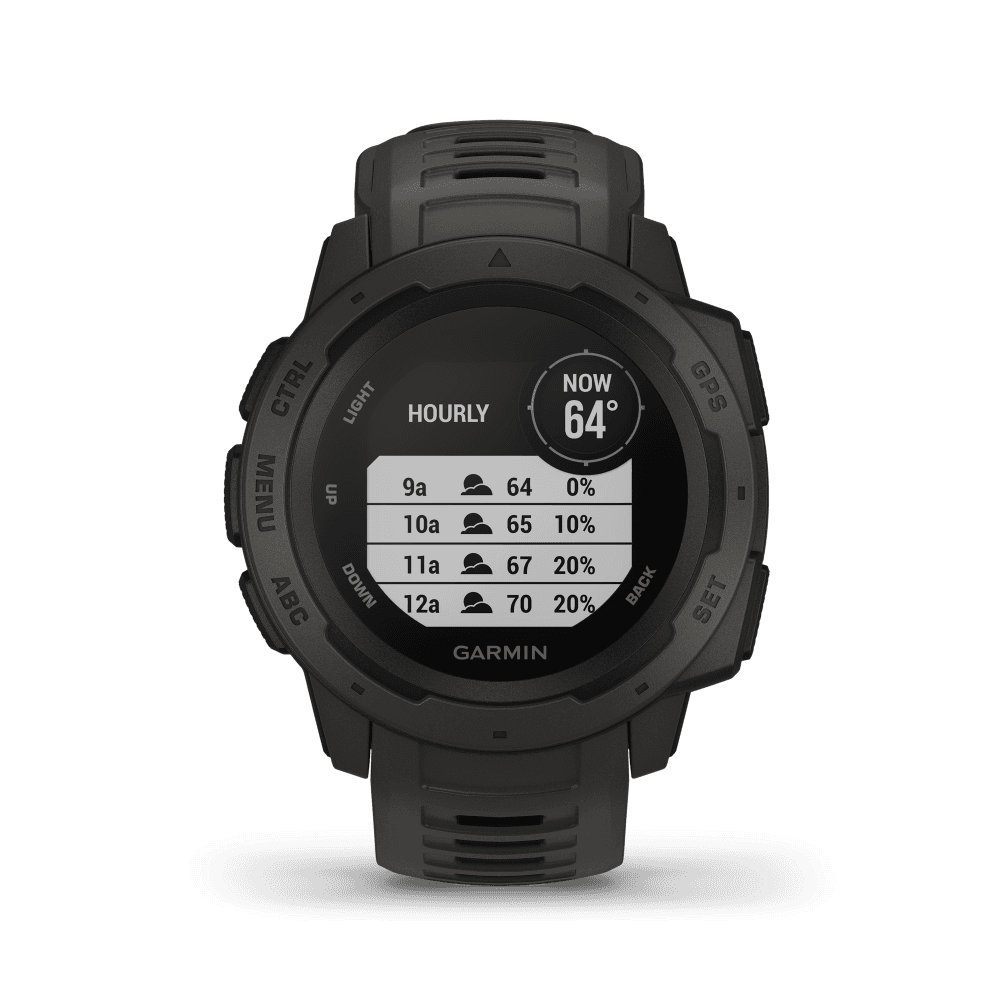 Garmin 010-02064-00 Instinct GPS Graphite Smartwatch Lens material – domed chemically strengthened glass Case material – fibre-reinforced polymer QuickFit™ watch band compatible – 22 mm Strap material – silicone, Physical size – 45 x 45 x 15 mm Fits wrists with the following circumference:Silicone band: 132-224 mm Weight – 52 g Water rating – 10 ATM Display type – Monochrome, sunlight-visible, transflective memory-in-pixel (MIP) Display size – 1.2” (30.4 mm) diameter Display resolution – 128 x 128 pixels Battery life – Smartwatch: Up to 14 daysGPS: Up to 16 hoursUltraTrac™ mode: Up to 40 hours Memory/history 16 MB Clock features Time/dateGPS time syncAutomatic daylight saving timeAlarm clockTimerStopwatchSunrise/sunset timesSensors GPSGLONASSGalileoGarmin Elevate™ wrist heart rate monitorBarometric altimeterCompassAccelerometerThermometer Daily smart features Connectivity – Bluetooth, ANT+, Wi-Fi Smart notificationsCalendarWeatherControls smartphone musicFind my phoneFind my watchVIRB camera remoteSmartphone compatibility iPhone, Android™ Compatible with Garmin Connect™ Mobile Activity tracking features Step counterAuto goal (learns your activity level and assigns a daily step goal)Sleep monitoring (monitors total sleep and periods of movement or restful sleep)Calories burnedFloors climbedDistance travelledIntensity minutesTrueUp™Move IQFitness age – yes (in app) All-day stress tracking Fitness equipment/gym Available gym activity profiles Strength, cardio and elliptical training, stair stepping, floor climbing, indoor rowing and yoga Training, planning and analysis features GPS speed and distanceCustomisable screen(s)Customisable activity profilesAuto PauseInterval trainingAdvanced workoutsDownloadable training plansAuto LapManual lapConfigurable lap alertsCustomisable alerts Virtual partnerRace an activity Course guidanceSegments (Live, Garmin)LiveTrackTrendline™ popularity routingTouch and/or button lockHot keysAuto scrollActivity history on watch Heart rate features HR zonesHR alertsHR calories% HR max% HRRRecovery timeAuto max HRHR broadcast (broadcasts HR data over ANT+™ to paired devices) Running features Available run profiles Running, treadmill running, trail running GPS-based distance, time and paceRun workoutsFoot pod capable Outdoor recreation features Available outdoor recreation profiles Hiking, climbing, mountain biking, skiing, snowboarding, XC skiing, stand-up paddleboarding, rowing, kayaking, tactical Point-to-point navigationBread crumb trail in real timeBack to startTracBackUltraTrac modeElevation profileDistance to destinationBarometric trend indicator with storm alertTrail run auto climbVertical speedTotal ascent/descentFuture elevation plotCompatible with Garmin ExploreTMGPS coordinatesProjected waypointSight ‘N GoDual grid coordinates Cycling features Available cycling profiles – Biking, indoor biking, mountain biking Courses Race an activityTime/distance alerts (triggers alarm when you reach goal)Speed and cadence sensor support (with sensor) yes (ANT+) Swimming features Available swim profiles – Pool swimming, open water swimming Pool swim metrics (lengths, distance, pace, stroke count/rate, calories)Stroke type detection (freestyle, backstroke, breaststroke, butterfly)Swim efficiency (SWOLF)Open-water swim metrics (distance, pace, stroke count/rate, stroke distance, calories) When you can rely on Instinct™, the world can rely on you. This rugged GPS watch is built to MIL-STD-810G and is water-rated to 100 meters. Keep your bearings with a built-in 3-axis compass and barometric altimeter. Multiple Global Navigation Satellite Systems (GPS, GLONASS and Galileo) help you track in more challenging environments than with GPS alone. Monitor your