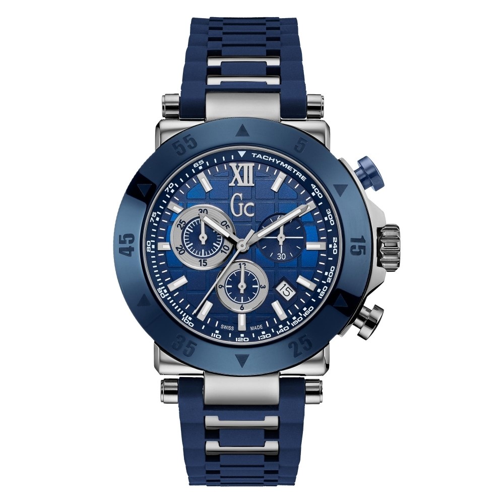 GC X90025G7S Men’s GC-1 Sport Chic Wristwatch CASE SIZE:ROUND, 44.0 MM, 12.0 THICKNESS CASE MATERIAL:Stainless Steel CASE COLOUR:Silver Tone WATER RESISTANCE:100 Meters WATCH GLASS:Sapphire Crystal BRACELET MATERIAL: Silicone BRACELET COLOUR:Blue CLASP TYPE:Deployment DIAL:Blue MOVEMENT:Quartz WARRANTY:2 Years This Gc-1 Sport 44m Chronograph timepiece features a blue textured dial housed in a polished stainless steel case with a brushed and polished blue PVD bezel and blue silicone strap with silver tone PVD inserts.