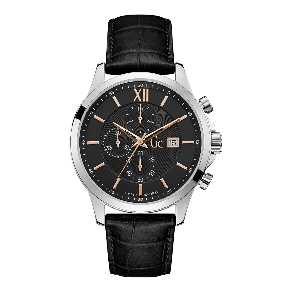CASE SIZE: ROUND, 44 MM, 12.0 THICKNESS CASE MATERIAL: STAINLESS STEEL 316L CASE CASE COLOUR: SILVER TONE WATER RESISTANCE: 100 METERS WATCH GLASS: SAPPHIRE CRYSTAL BRACELET MATERIAL: GENUINE LEATHER BRACELET COLOUR: BLACK CLASP TYPE: BUCKLE DIAL: BLACK MOVEMENT: QUARTZ CHRONOGRAPH WARRANTY: 2 YEAR LIMITED WARRANTY This Gc men’s chronograph watch has a black textured dial with chronograph sub dials and a date window. It is set in a stainless steel case with a black leather strap.